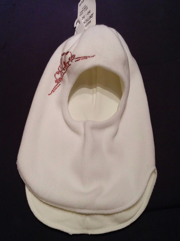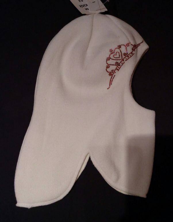 Шлем белый со стразами на одной стороне, 50 % шерсть, 50 % акрил. На ценнике стоит 345 руб., на кассе пробили 172, 50 руб. (рядом со стойкой-ценой висело -50%).