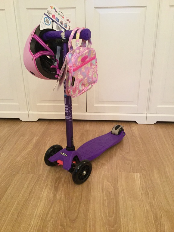 С покупкой! Мы мини взяли в 1,8. Все смотрела на такую же сумочку — классная! Но у нас самокат и шлем оранжевые — пришлось без нее... Красивый у вас комплект получился!