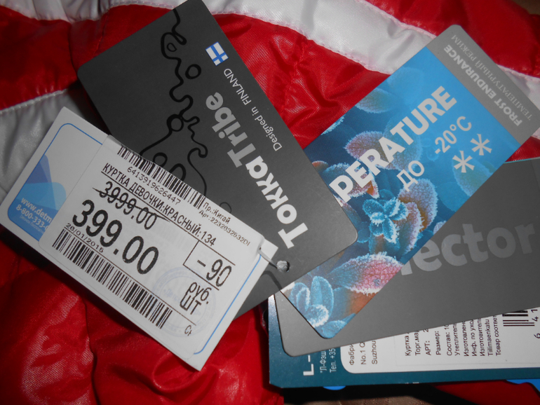 Распродажи. Скидки. Акции.Продолжаются распродажи в "Детском мире". Купила вчера 05.02.2015 на Баббушкинской в "Дет.мире" куртку "Токка" (это не Рейма, конечно, но цена...). 90% скидка. была 3999, стала 399. А у меня еще бонусы...Так что мне обошлась в 320 руб! Куртка размер 134 (а у дочки пока рост 104 см!!). Куртка классная: до минус 20 заявлено (ну, мы такие до минус 5 носим...и на каток), внутренние манжеты, снеговая юбкам...ммм..под катом еще фото