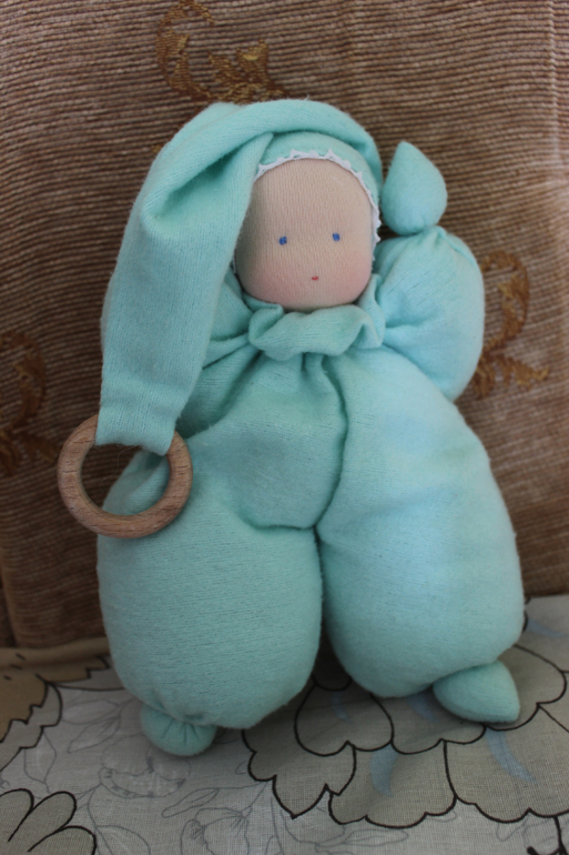 Итак, мы получили небольшую, очень милую и добрую куколку ручной работы, сшитую из фланели. Размер 22 см. Мастеру миллион благодарностей, малышка действительно сделана с душой, очень уютная и теплая. На ее длинном колпачке имеется деревянное колечко, которое Костя с удовольствием пробует на зуб перед сном.) Сама куколка очень нежная и мягенькая.