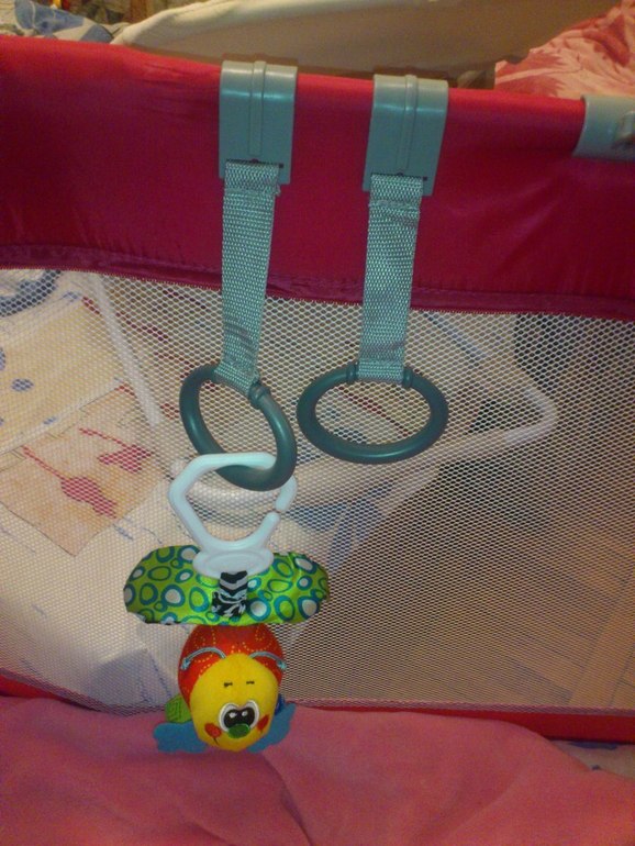 В комплекте есть кольца, чтоб ребенок за них брался и вставал. На них можно повесить игрушку какую-то))