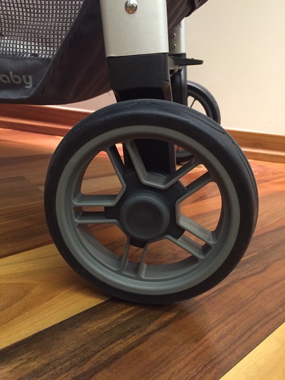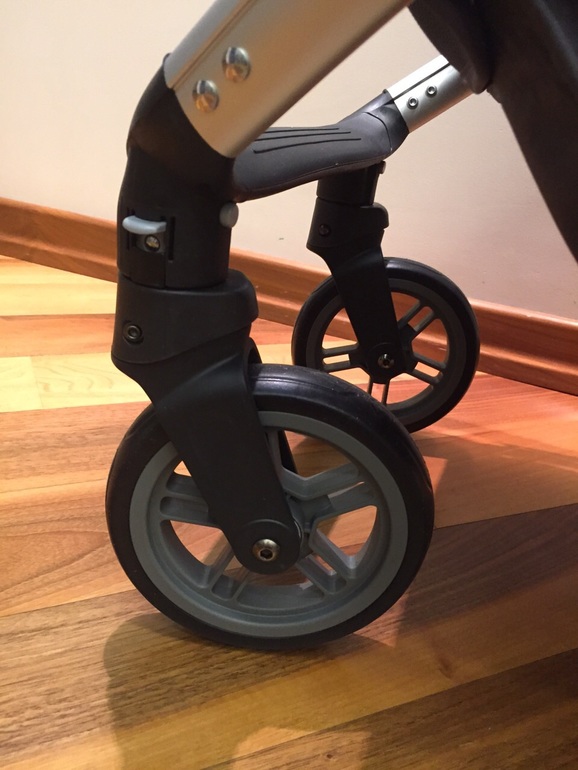 Колеса резиновые. Передние поворотные и их можно зафиксировать. Амортизация на все колеса. Подвеска чуть жестковата, но это исправимо. Смажьте все пружины и разработайте их самостоятельно.