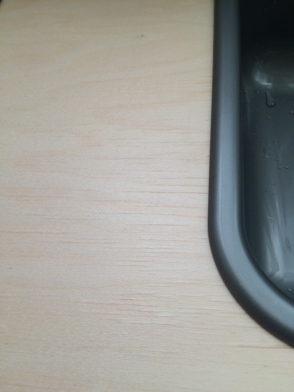 Каюсь налила чуть воды в раковину помочили тарелки, воду на столешнице не оставляли, практически сразу вытерали