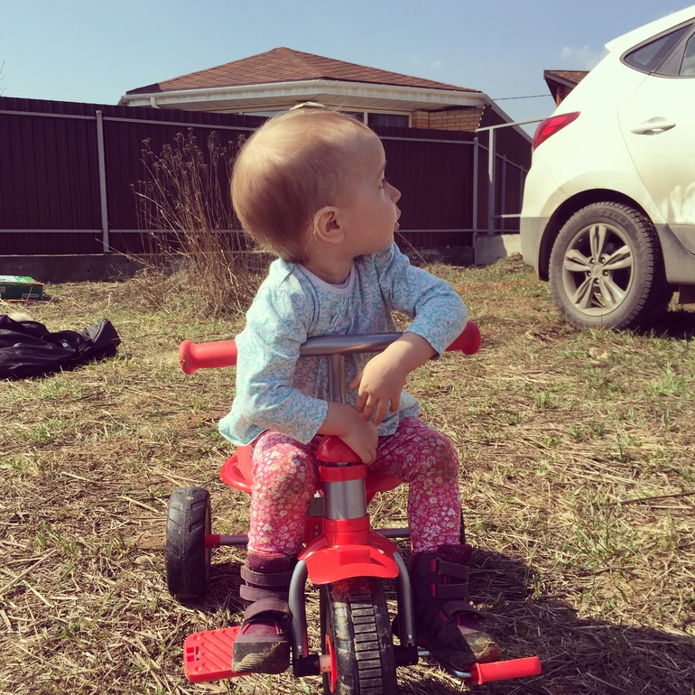 Научились рулить под мамину команду -лево, право и крутить педали когда мама толкает, сами так и не поехали: сил всетки в ногах не хватает