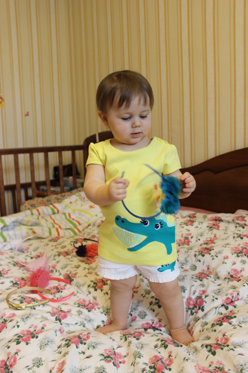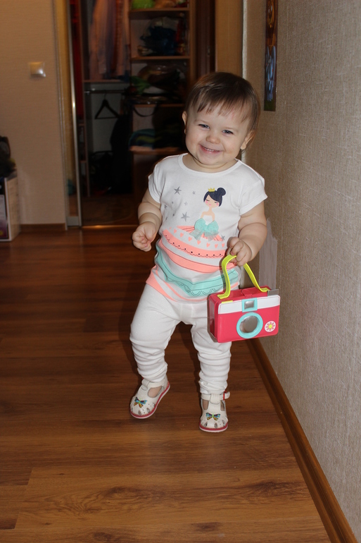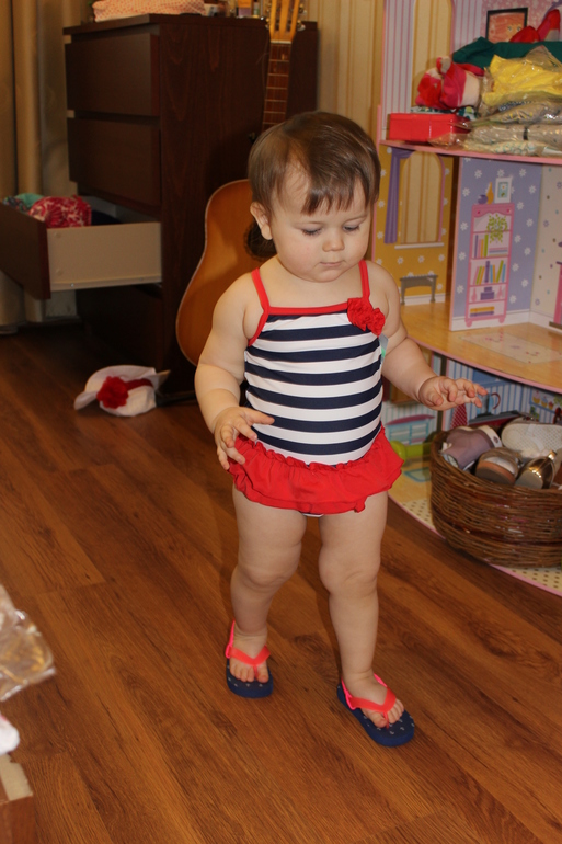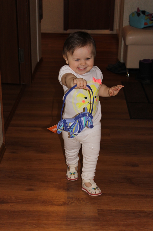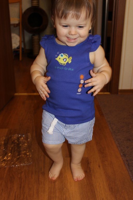 Набор на море. Не знаю влезем ли в купальник летом. Уже как раз. Панаму постоянно пытается снять. В сланцах ходит нормально. Резиночки спасают. Заказала к лету еще кроксы.(((