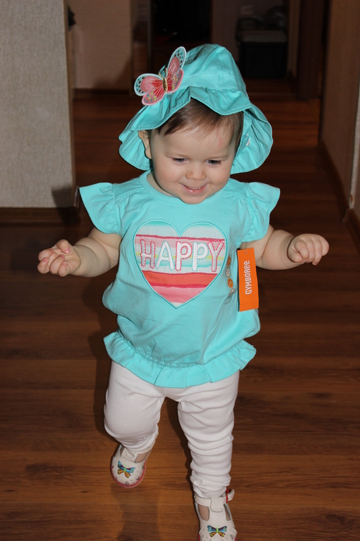 Набор Картерс на 24 мес., пока сильно велик. Ближе к осени, наверное будет отлично. Цвет супер. Маше очень подходит под глазки)