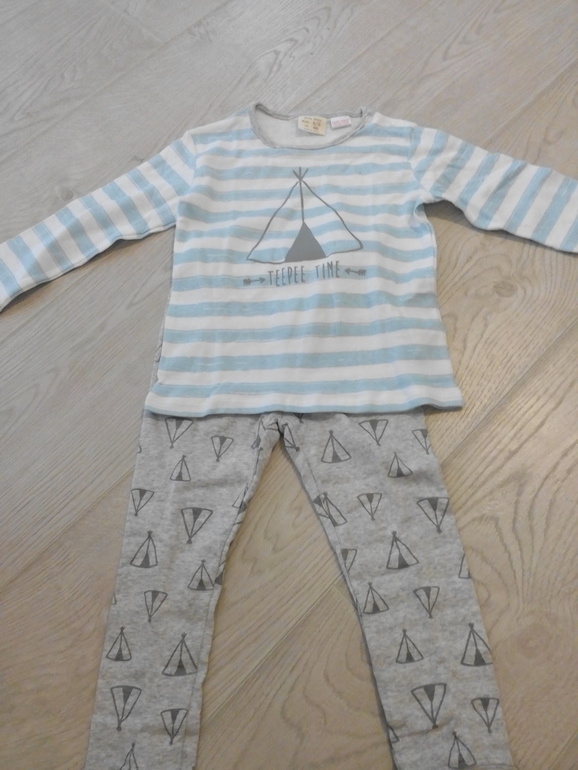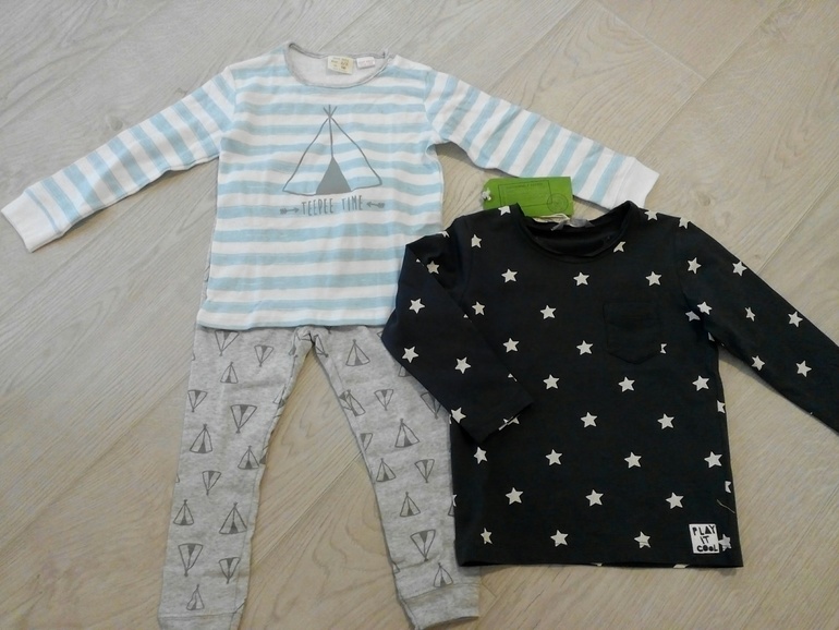 Пижамка zara на рост 98, написано, что на 2-3 года, мне кажется немного маломерит. Очень мягкая. Думаю, что будем носить как домашнюю одежду, в пижамах не спит.