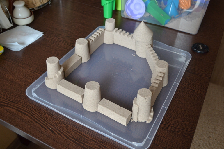 Использовала песок массой 2,5 кг, ушло наверно 2/3, так что этого количества вполне хватит для построения подобного "замка", но если детей двое и больше, я бы посоветовала все-таки взять 5 кг.