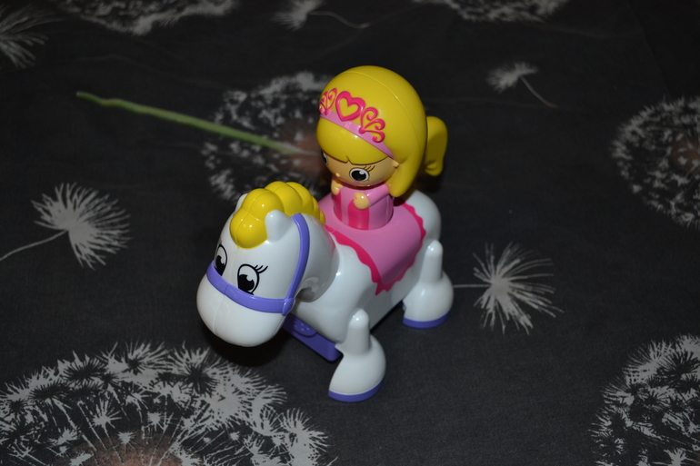 Нажимаем на голову принцессе, коняшка начинает ехать и качает головой, издаются звуки ввиде ржания коня и скакания. Очень весёлая игрушка, кстати подойдет тем кто учится ползать)