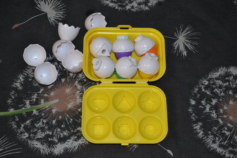 Игрушка на первый взгляд очень простая, какие то там яйца в скорлупе, но во-первых её можно использовать как сортер, совмещая фигуры на дне яиц с выемками в контейнере