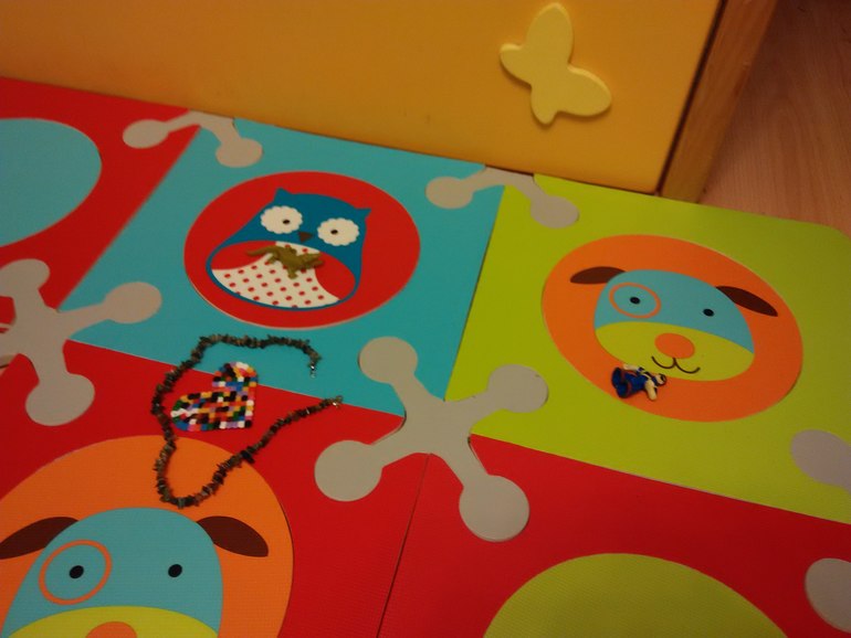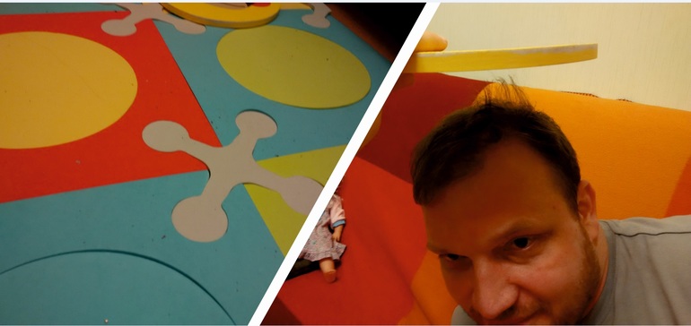 3. Насчет расцветки - на мордашках зверят мелкие игрушки мало заметны... если ребенок раскидает их и забудет убрать, а потом наступит случайно - может быть бо-бо ножке.. Но это проблема любых пестрых расцветок. Здесь же - всего в меру, глаза не режет! =) Для спокойствия можно после игр переворачивать вставки со зверюшками обратной стороной - чтобы точно не наступить на острый крокодилий хвост или чудесный камушек, подобранный на улице и "спрятанный" в укромное местечко =)