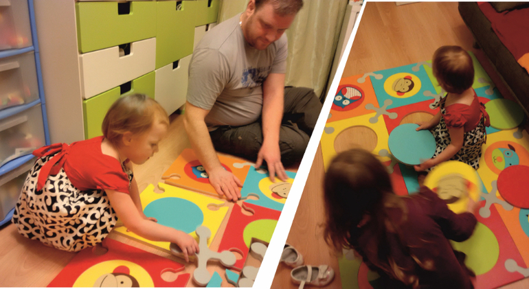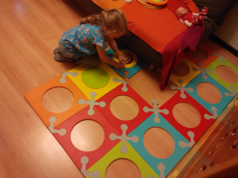 1. Самый главный - если ребенок собирает коврик сам, потом сам же бегает по нему, взрослому лучше проверить, чтобы все детали были на месте и ничего лишнего ниоткуда не торчало - Олька у нас споткнулась о вставку в одном из своих забегов по комнате.. Но - ПОЛОЖИТЕЛЬНАЯ ЧЕРТА - бухнулась на этот же коврик, о который споткнулась, встала и кричит: "Мама, я мягко упала! Мне не больно!" =) Так что с такими вещами нужно быть аккуратнее..