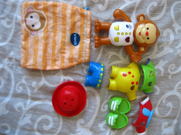 На Новый год была подарена обезьянка от VTECH , как я и ожидала обезьяна нам пришлась по вкусу. Играем каждый день. Сама обезьяна выполнена из прочного пластика, роняли ее неоднократно, в комплекте одежда, обезьяна и мешочек для хранения одежды. Обезьяна говорящая, учит ребенка цветам, одежде, погоде. Просит одеть ей например желтые штаны, при этом сердечко на груди светится. Одежда легко одевается-снимается, единственное дочка до сих пор не может совладать со шляпой. Минусы- мало одежды, хотелось бы побольше, обезьяна в мешочек не вмещается, точнее вмещается, но тогда не вмещается одежда, короче в мешок можно положить либо обезьяну, либо одежду.