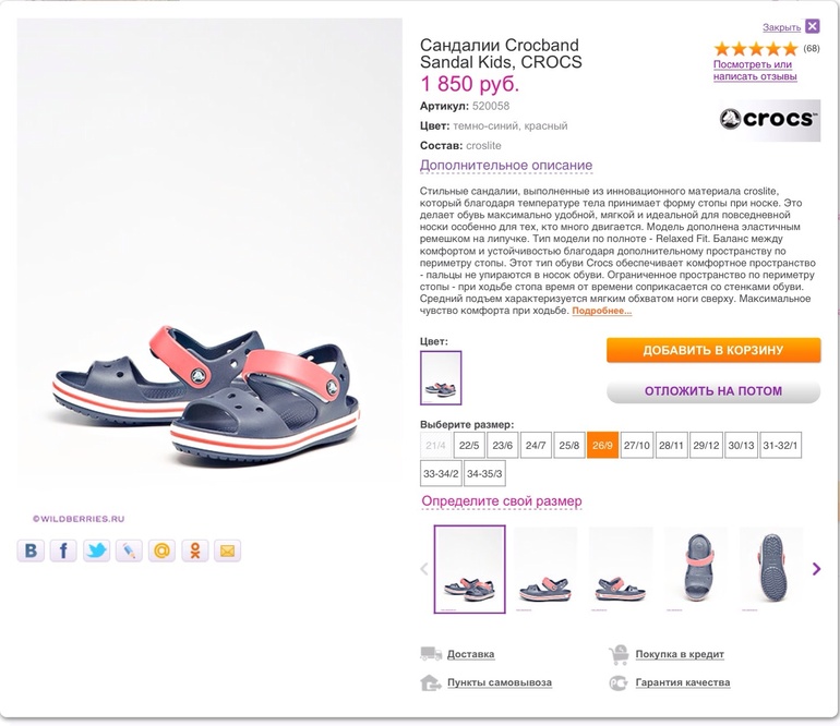 Спасибо за наводку! Заказала две пары на выбор. Удивительно, но сегодня ночью увидела, что скидка 25%, но по поиску кроксы-детская обувь, такие сандалии не выпали, посмотрела нет и упокоилась, а сегодня в ленте увидела и уже по артикула нашла их. Хитрят wb...