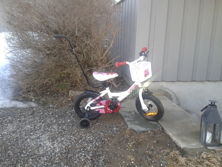 И так, не много о самом велосипеде. Есть два дополнительных (вспомогательных) колёсика, ручку для помощи докупали отдельно, рама - аллюминевая велосипед не тяжёлый, но и ветром его не сдует, колеса - 12" дочка ростом 93, такой размер колёс оказался идеальным, на следующий год тоже получится покататься, велосипед оборудован всевозможными отражателями и лампочками.