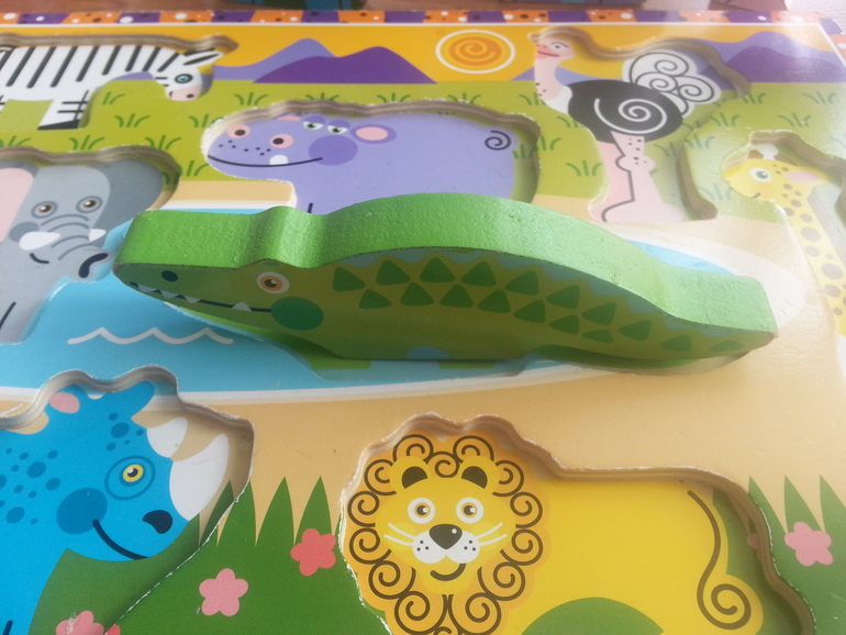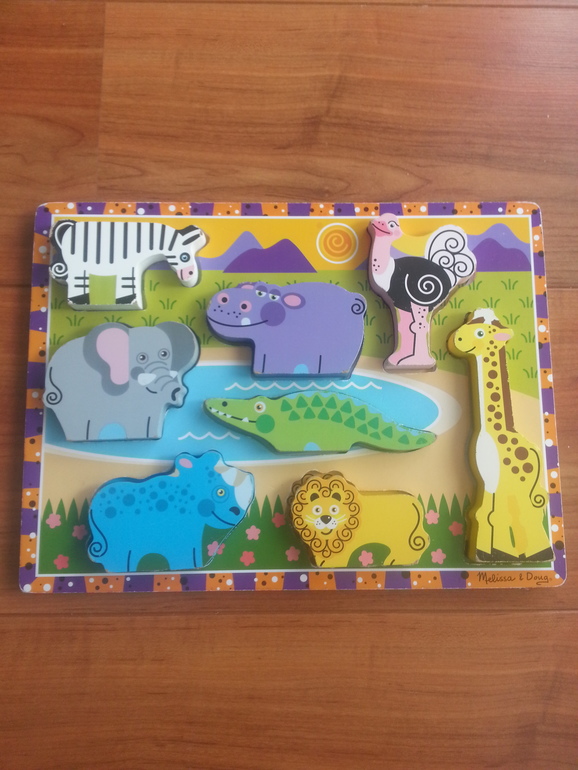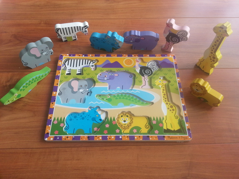 Наш хит номер 1 - доска с вкладышами Melissa&Doug Safari animals. Фигурки из дерева, хорошо стоят сами по себе. Вначале учили по ним животных, теперь любит доставать-вкладывать. Грызет, не без этого. Но краска пока держится.