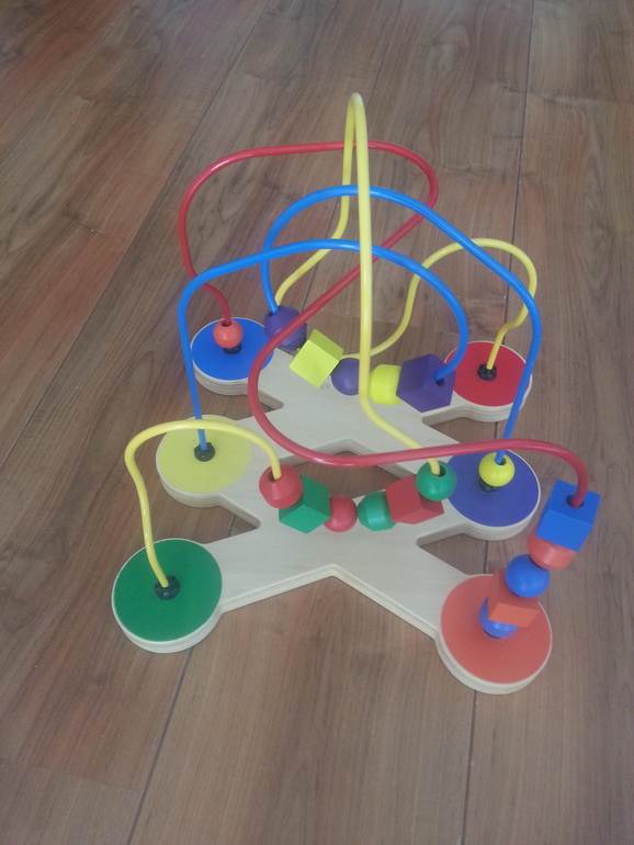 Итак, Bead maze от Melissa&Doug. Купили в год, начала пытаться играть примерно в 1.1. С тех пор каждый день обязательно пробует попередвигать фигурки.
