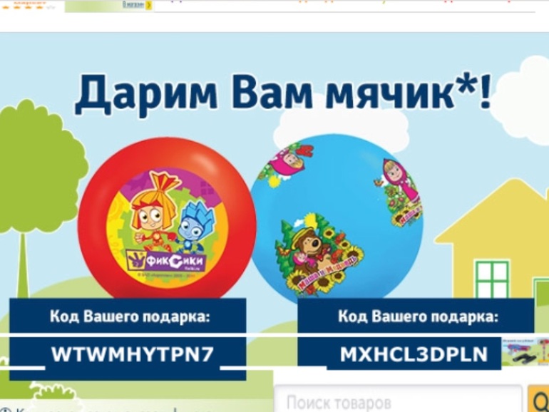 *Подарок предоставляется в случае приобретения товара на сумму не менее 1500 рублей. Только 300 штук "Мяч Фиксики в ассорт." и 150 штук "Мяч Маша и Медведь в ассорт." в наличии. Выплата стоимости подарка в денежном эквиваленте невозможна. Предложение действительно пока подарок есть в наличии. Применить код подарка к уже оформленным заказам также невозможно. Код подарка вводится в ходе оформления заказа. На одну семью и один заказ может быть использован только один подарок. Одновременно использовать сертификат, скидку а также право на бесплатный товар - невозможно. Инструкцию по использованию и ограничениям сертификата можно прочесть на .