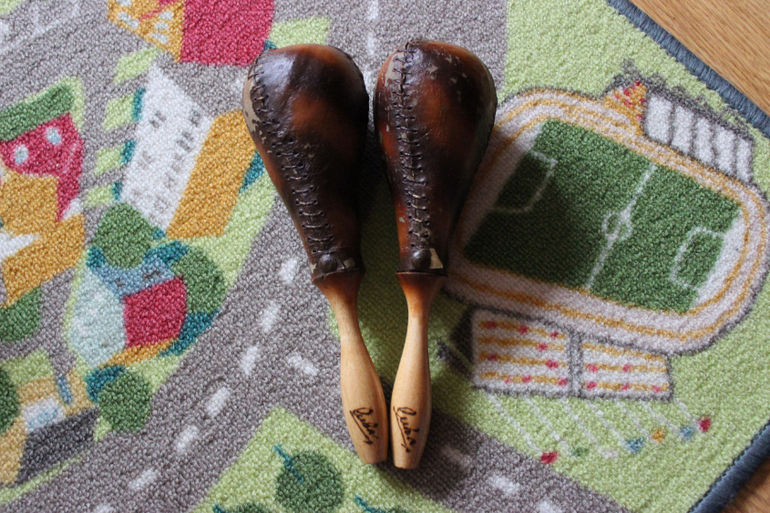 Маракасы. Костикова большая любовь. У нас когда-то были погремушки-маракасы, дед покупал. Но качество оказалось очень неважным и они довольно скоро поломались. Потом мы с мужем вспомнили о настоящих маракасах, которые были привезены нами с Кубы. По размеру они конечно великоваты для сына, но зато звучат хорошо!)