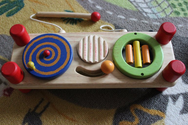 Музыкальная панель I'm Toy. Это очень достойная вещь. Еще совсем недавно я собиралась ее продать, потому-как она изначально была как-то заброшена сыном. Потом, может в той же развивашке, насмотрелся на то, как играть на трещотке и ксилофоне, и, вуаля, она стала ему интересна. Сделана очень качественно, звук хороший, все ровное и гладкое. Здесь и трещотка с ксилофоном и тарелки, и колокольчик. В общем, есть где разгуляться.