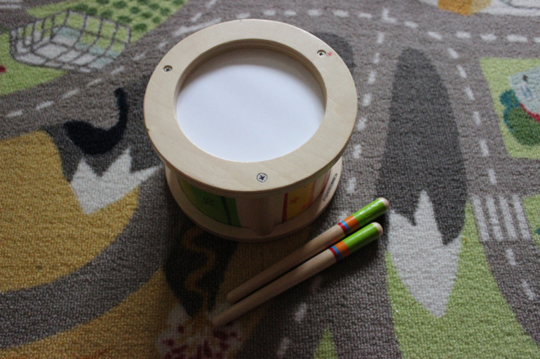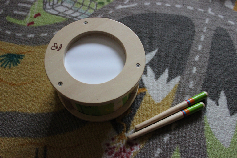 Барабан. Как-то на Мамси была распродажа Hape, и я хапнула этот барабан. За ту цену, что он достался, вполне себе достойная игрушка. Меня только слегка разочаровал размер самой мембраны - мне бы хотелось чтобы она шла сплошняком, без границ. А на одной из сторон область куда бить, получается совсем маленькой. Палочки добротные. Все деревянное, как положено. Сын пока к нему равнодушен, зачастую он просто катает его по комнате).