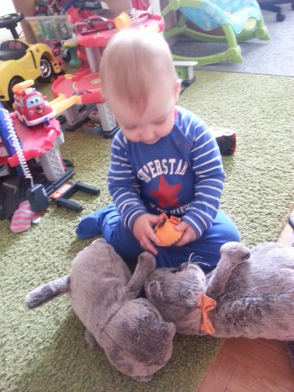 У нас есть громадный медведь, Эрик иногда с ним няшиться, просто хочу малышню к кроватке приучить, поэтому хочу зверушку ему под бочек.