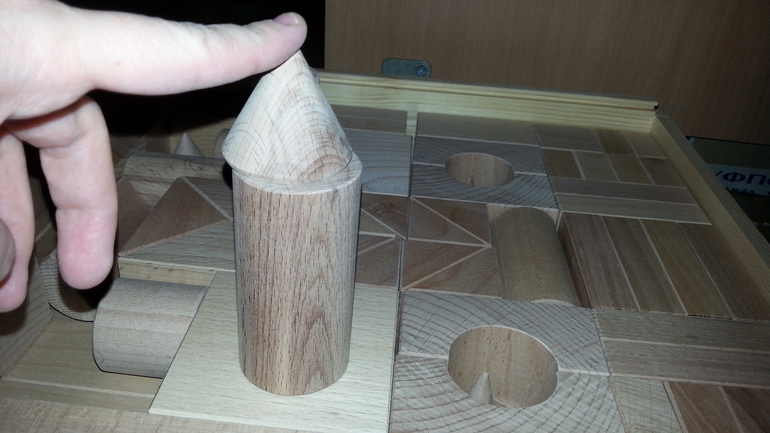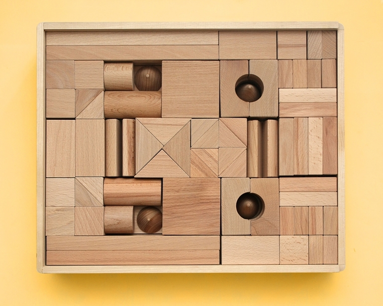 А знаете сколько весит наш конструктор? 9,5 кг почти). А деталей в нем 107 - хоть застройся))) Сын сразу облюбовал одну и грыз-грыз-грыз... крепкие детали(ну бук же) , добротные такие... Остались только ооочень слабые светлые царапины, без микроскопа не разглядишь. Очень нравится. Нам, конечно, ещё рано играть в него, но я буду строить, а сын демонтаж совершать. Фото с сайта( детали в 2 ряда, ряды разные)
