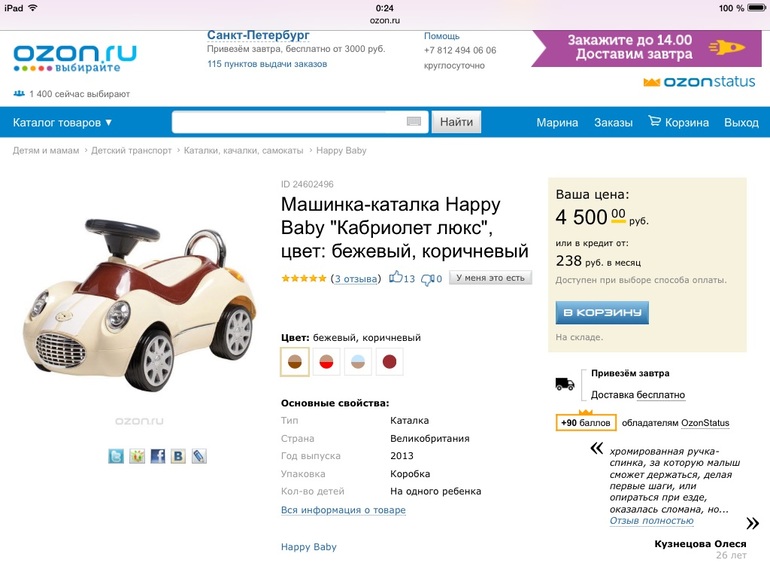 Вообще когда я искала, именно бежевая стоила 4500. А все другие дешевле. Я вроде за 2500 брала свою. Сама не катается. Ноги еще не достают. Но любит, когда ее катают. Ходит с ней. Полю на ней сама катает.