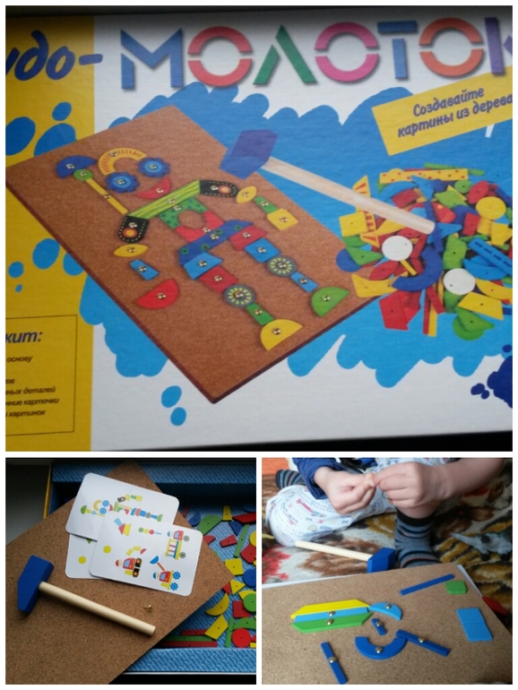 Чудо-молоток. Хотела набор геометрических фигур для составления картинок. Выбирала между магнитным набором и этим. Ребенку интересно забивать молотком, но гвозди острые как настоящие, без присмотра не оставишь, не во всех детальках сквозные дырки.
