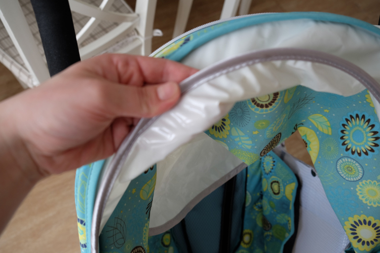 5. ткани на сиденье сетчатые, верх отстегивается на молнии и летом в жару все продувается(см. фото) На спинке посередине мягкая вставка, внутри спец наполнитель чтобы спинка ребенка не потела.