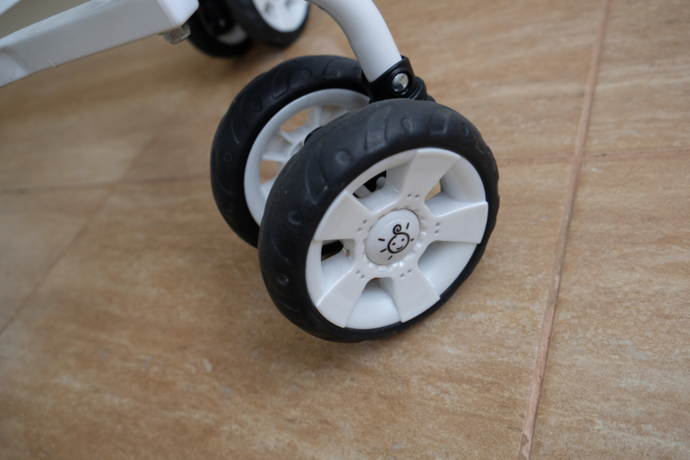 1. ходовые качества на высоте. Коляска едет абсолютно беззвучно, как они так сделали и из чего колеса я не пойму... на вид вспененная резина, с протекторами, поэтому на гладкой поверхности(скажем в магазине) не проскальзывают как обычно. Еднет легко, повороты легко, на бордюры легко, это при том что у меня дочка почти 17кг сидит в коляске.