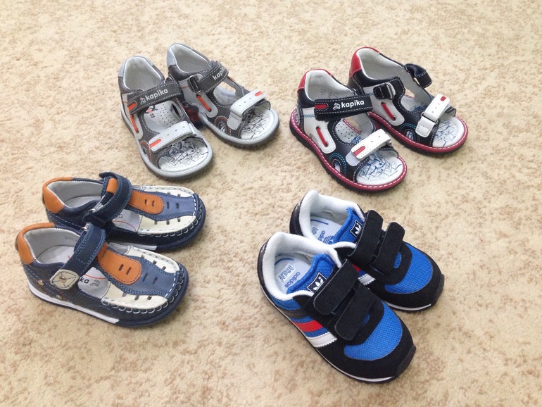 Обувь- капика. Одни босоножки- на выход, другие- по двору бегать. Мне нравится эта фирма, она меня полностью устраивает. Малыш сейчас в таких по дому ходит. Кроссовки- адидас.