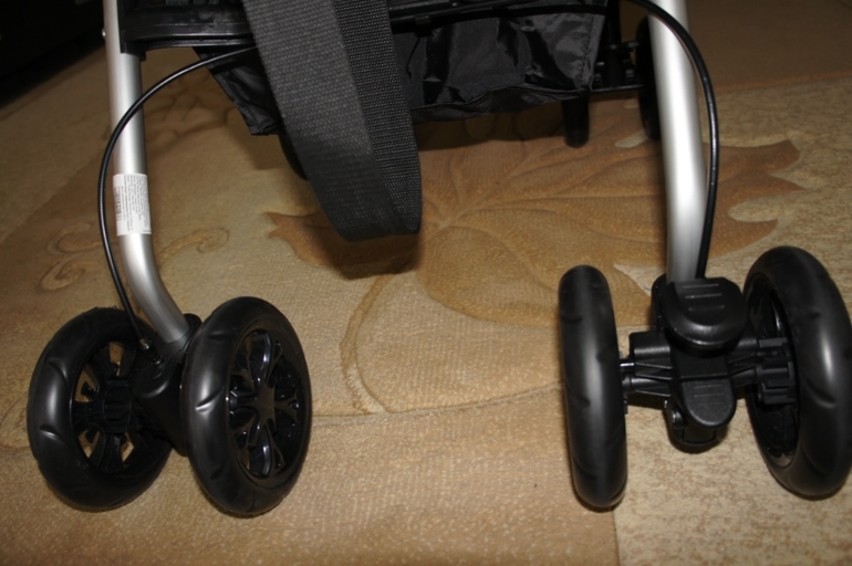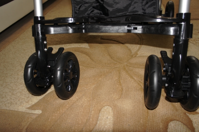 Тормоза на всех колесах. удобные, не пачкучие. Задине колеса одной педалью блокируются. Передние поворотные с фиксацией..