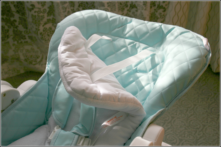 Специальная вкладка для новорожденных: синтепоновый матрасик обшитый махрой сверху, хлопковой тканью снизу. Чехол на матрасике не съемный, т.е. матрасик стирается целиком. После стирки не деформировался. Ремни снимаются каждый по отдельности и легко отбеливаются при загрязнении любым отбеливателем.
