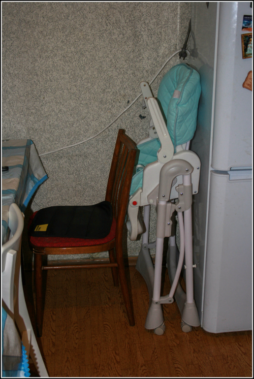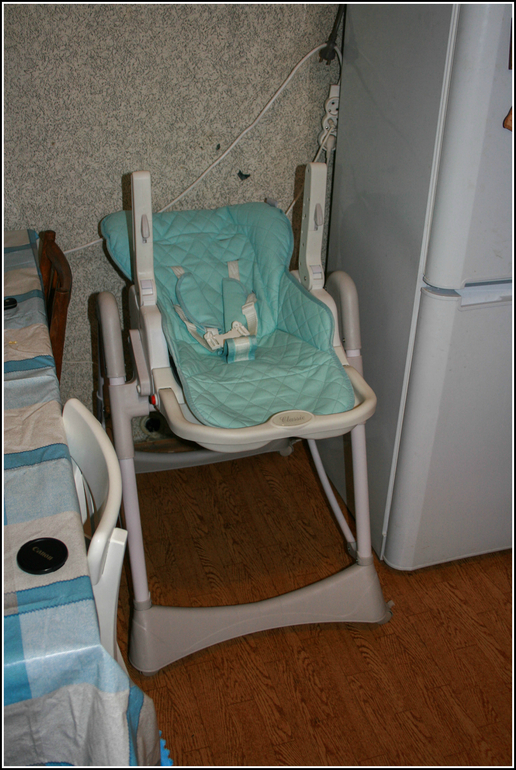 Ни для кого не секрет, что условия у всех разные и один и тот же объект в разных помещениях может создавать неудобства, а может приносить пользу стоя в уголочке. В нашем случае еще на стадии въезда в съемную квартиру и планировки я расставила мебель так, чтобы в будущем для стула-шезлонга ребенка было оптимальное место и подальше от плиты, брызгов и горячего.