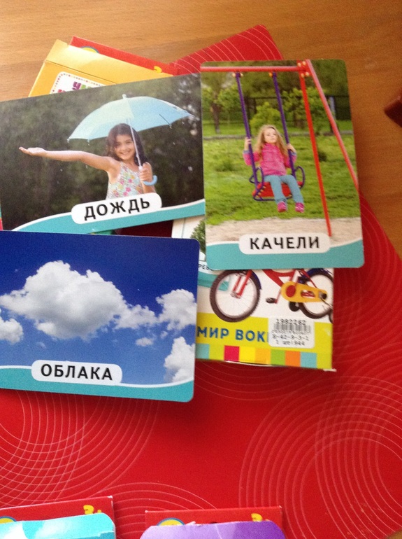 После этого я поняла, что прогресс есть и докупила еще несколько наборов. Удачные: Мир вокруг нас. Мы не просто за три раза освоили все слова, но и говорим предложения, например Девочка катается на качелях.
