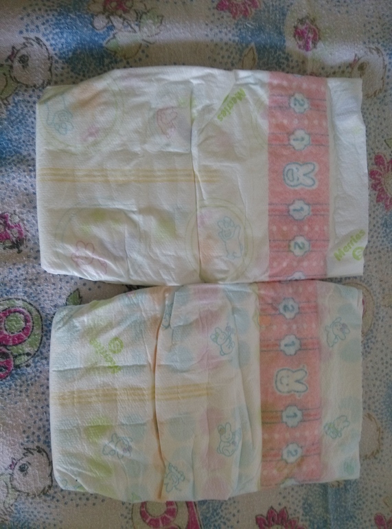 ПодгузникиКупила я для пробы маленькую пачку мериес М. Оказывались подгузники больше по размеру чем муни М. Купила мериес S маленькую пачку. Походили и я решила брать большую пачку. Открыла и немножко офигела