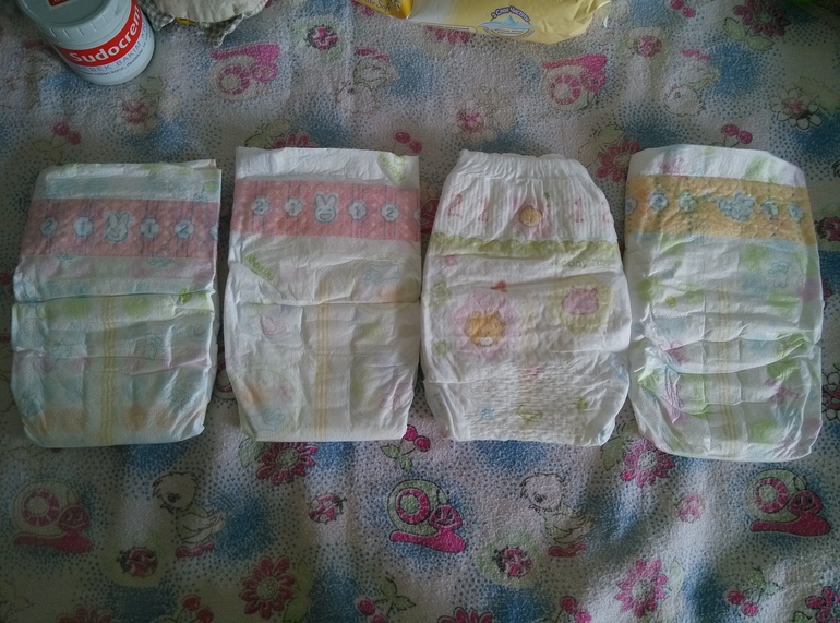 Слева на право: Мериес S из маленькой пачки, Мериес S из большой пачки, Муни M большая пачка, Мериес М из маленькой пачки.
