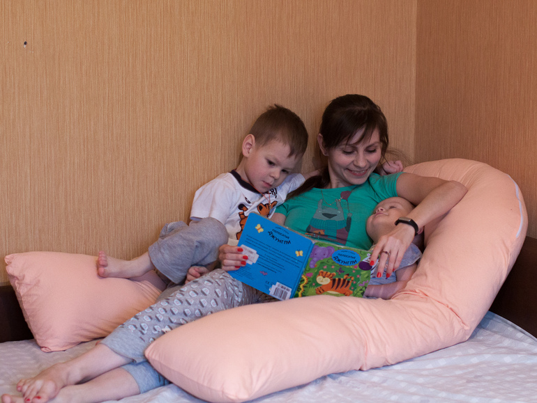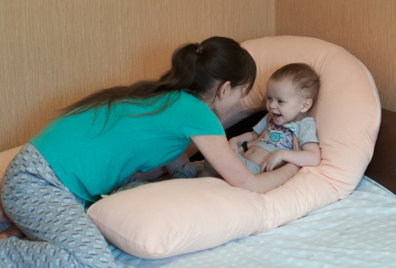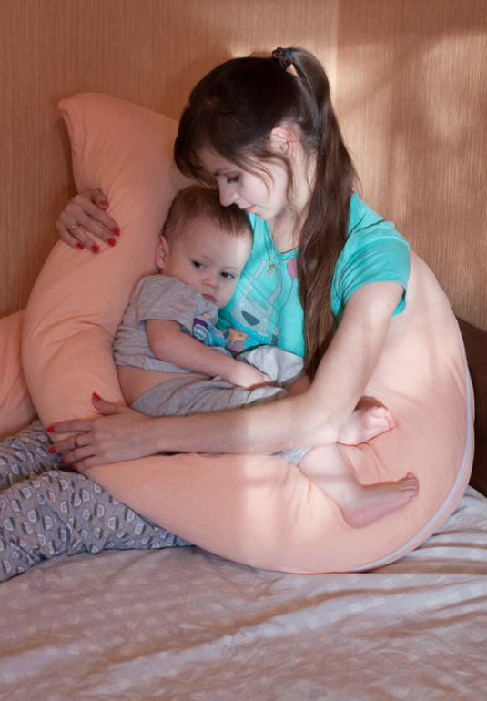 В этом деле подушка помогла мне сразу по двум фронтам: во-первых, было удобно мне лично. Как я уже сказала, мальчик стал тяжеловат, удерживать его на одной руке длительное время не слишком удобно. Подушка его приподняла, взяв на себя «работу» моей руки, тем самым подарив моим рукам относительную свободу.