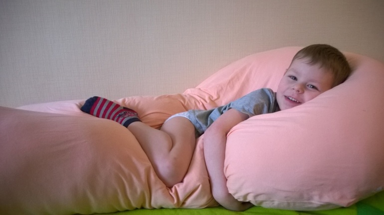 Когда я это обнаружила, то стала использовать подушку и для укладывания сына на дневной сон. Может, это и неверный педагогический ход, но раньше я обоих детей укачивала на сон, таская на руках или в слинге. Ноги мои не были мне благодарны. Да и спина тоже. Сейчас же достаточно взять подушку, обмотаться ею самой, окутать ребенка и спеть песенку. Все, сонный малыш готов! Он в подушке так здорово пригревается, звуки, издаваемые в это время шумным старшим братом, приглушаются, подушка приятно пружинит под телом (ритм задаю я, слегка покачивая малыша на коленках). Как тут не уснуть? А когда Сашик засыпает, его легко переложить с рук на кровать прямо в этой подушке. Тут подушка еще и функцию защитного бортика на себя берет, если класть ребенка на родительскую кровать. Мои дети во сне часто крутятся и переворачиваются, так что приятно, что теперь есть такой мягкий и надежный ограничитель.