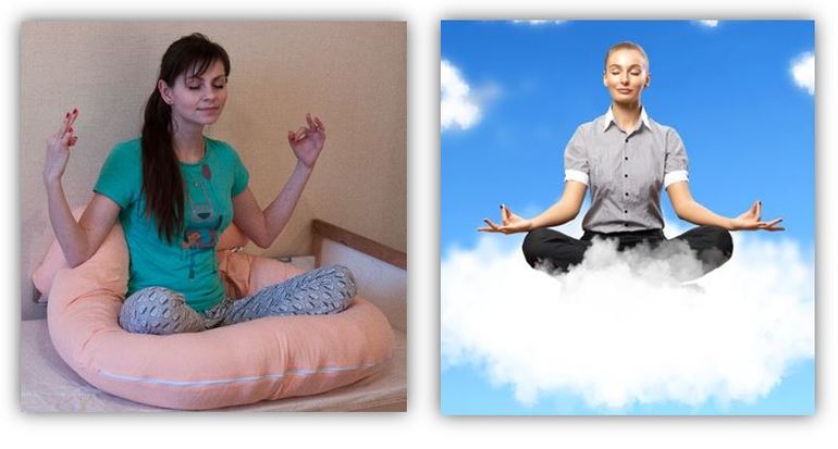 Подушка хороша не только для расслабленного возлежания, она и для восседания годится. Не просто «подложила, что было», а именно окутала себя подушкой, устроив настоящее гнездо или облако: удобная поддержка ног в позе лотоса (особенно актуально новичкам без растяжки), уютно и мягко, никакой дискомфорт не отвлекает от сосредоточения на себе. Полный дзен.