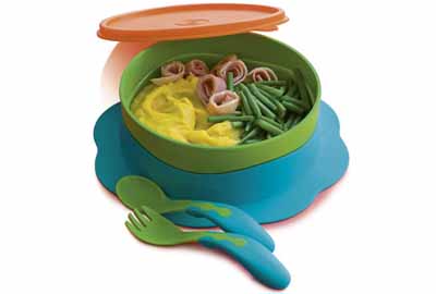 У нас такой же набор тупперваровский,присоска для тарелки не понадобилась,вилочка с ложкой удобные,еще есть поильник от такой фирмы,тгже классный,мягкий силиконовый носик.