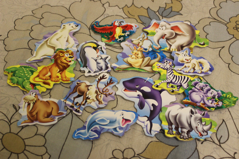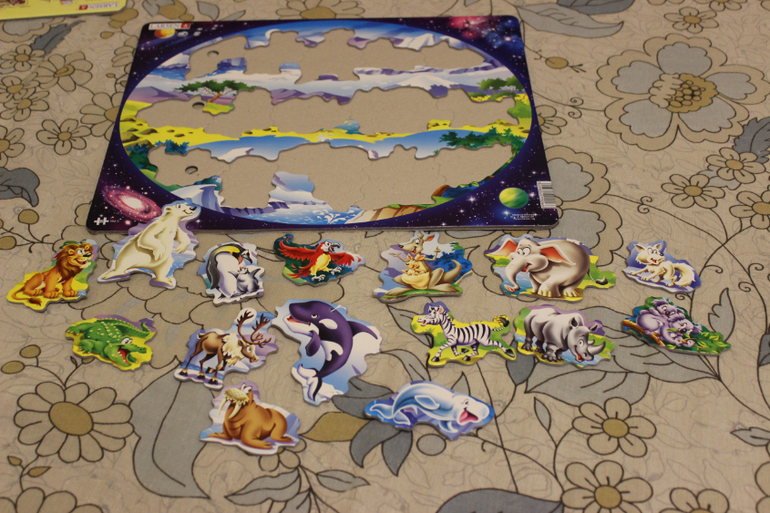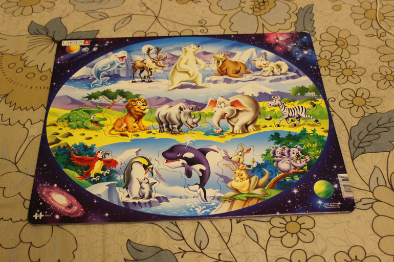 Итак, о наших пазлах Ларсен. Первым был приобретен пазл "Планета животных". Костя хорошо с ним справляется. К тому же здесь новые для нас животные, которые несомненно сыну интересны. На пазле изображены части света и их обитатели. Животные очень милые и добрые.