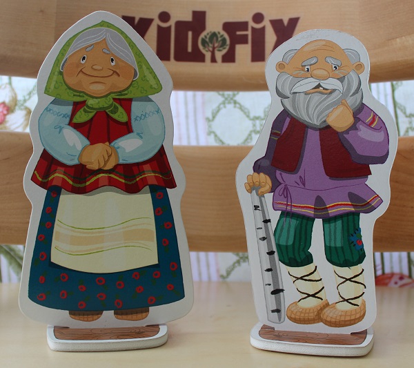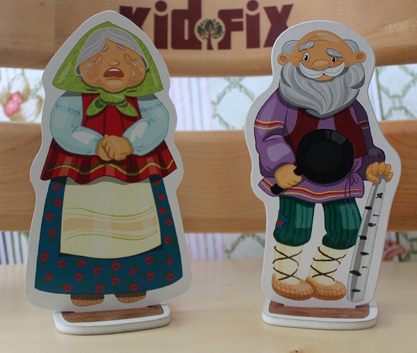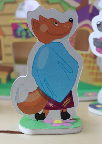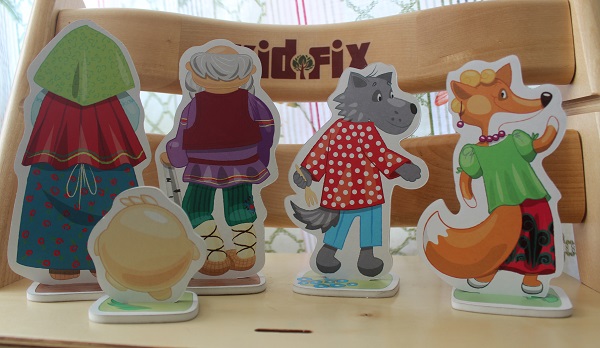 Это самая навороченная сказка. Тут есть и просто фигурки на подставках, и их уменьшенные копии в окошках. Теремок не просто двусторонний, он прорисован с лица и спины.