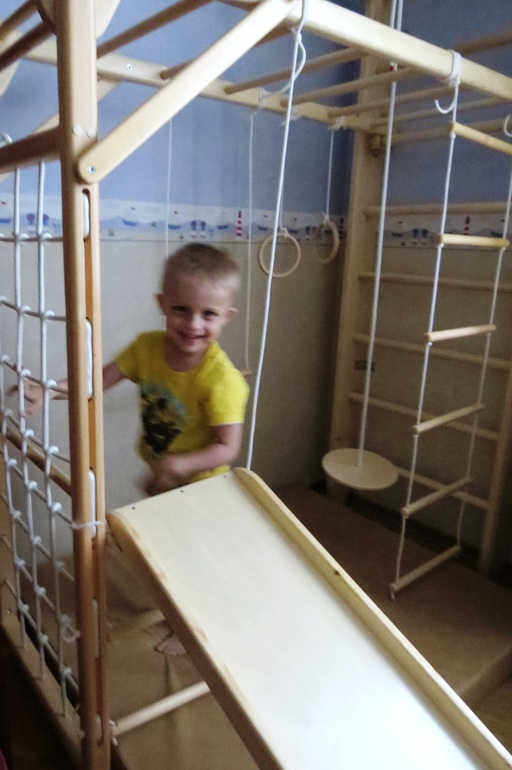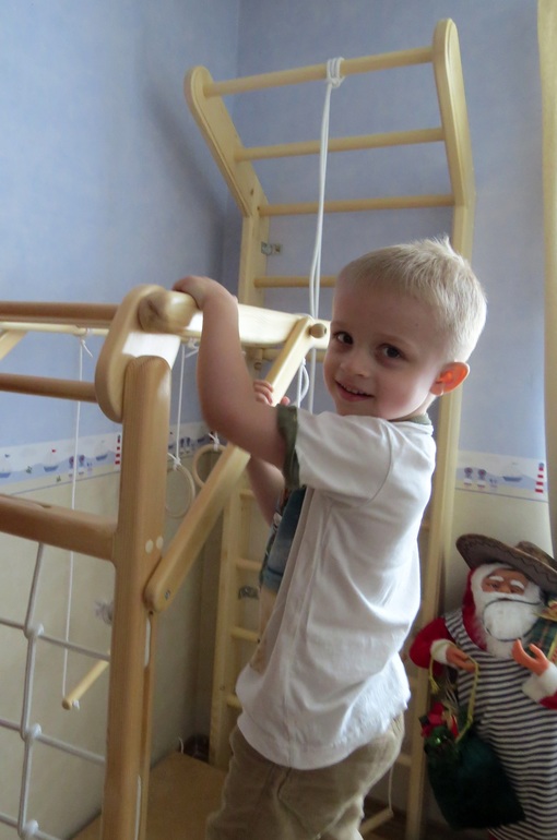 При выборе спортивного уголка у нас было несколько существенных ограничений: во-первых, совсем небольшое пространство, во-вторых, комплекс должен быть пристенным ( то есть крепиться к стене), так как установка враспор между потолком и полом у нас невозможна из-за гипсокартонного потолка. Ну, и третье - не ограничение, а скорей, пожелание - комплекс хотелось только деревянный - натуральный и "теплый")))