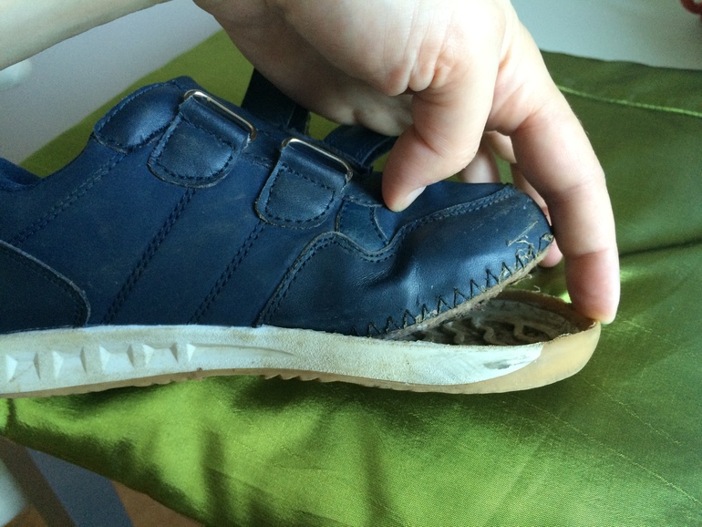 Внутренняя часть башмачка, наверное, сделана из бумаги. Теперь эта бумага скаталась. Ну или мы по болотам в этих ботинках ходили, а я и не заметила.