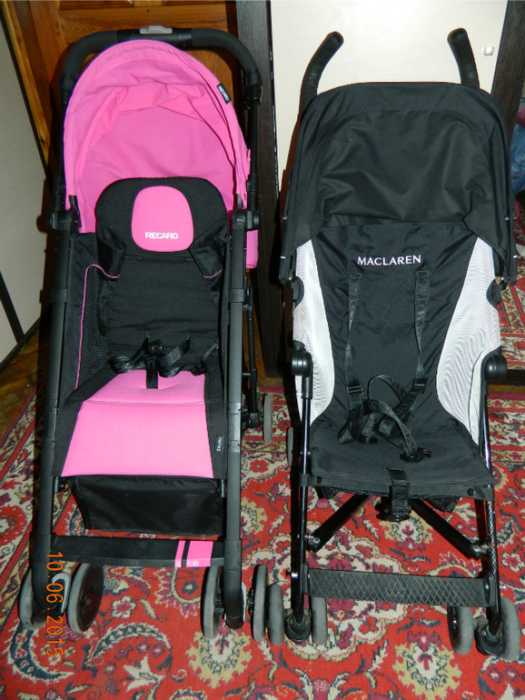 Капы у обоих недоразвитые, но у мака все же лучше от солнца закрывает и в сложенный можно что-то положить. У воло на боковых распорках ,как у большинства тростей, у рекаро на трещетке, довольно шумной.