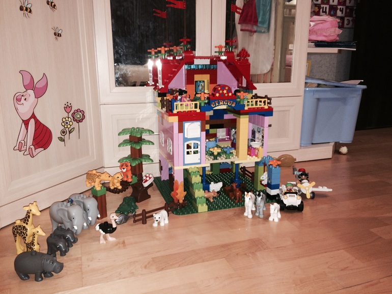 У нас есть наборов 12-14 (маленькие тоже учитываю). На этом останавливаться не планируем, так как Лего в нашей семье очень прижилось, играем все вместе. Из желаемых упустили Большую Больницу, увы (но это больше для меня). Первый купили год назад, и интерес дочкин проснулся не сразу. Зато когда это произошло, мы могли по несколько часов над ним чахнуть. Сейчас Арина уже осознанно играет в Лего. После небольшого перерыва, она по 2-3 часа безвылазно с ним занималась, что-то строила. Но больший интерес пока все-таки фигурки вызывают (а строим в основном мы с мужем), поэтому она рассадила всех человечков и зверье в транспорт и дальше они у нее летали/плавали/ездили в поезде и машине. Теперь Арина еще стала интересоваться питанием животных, поэтому с фигурками зверюшек мы разбираем, кто что ест. А в последние пару недель появились еще и ролевые игры! В общем мир Lego Duplo не имеет границ!