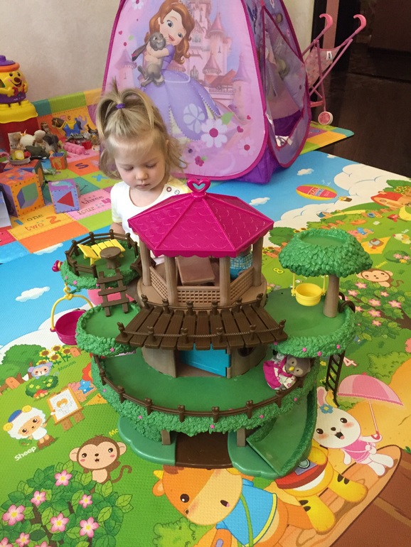 Я даже не ожидала, что настолько интересная игрушка, дочке моей 1,8 исполнилось, поэтому мелкие детали я убрала пока, играет целый день, в домик заселены были не только совы, но и все кто туда поместился))), играть можно с несколький сторон, катает всех с горки и на качелях.
