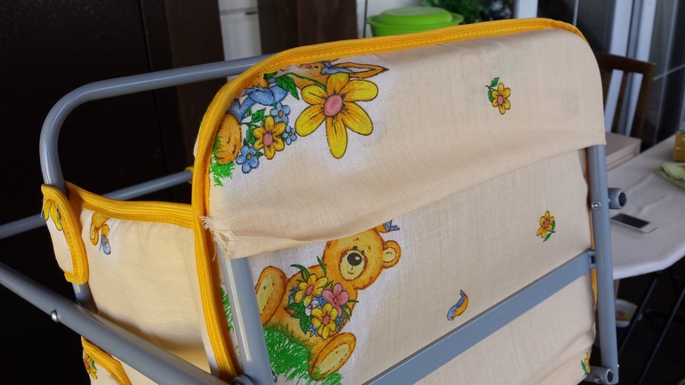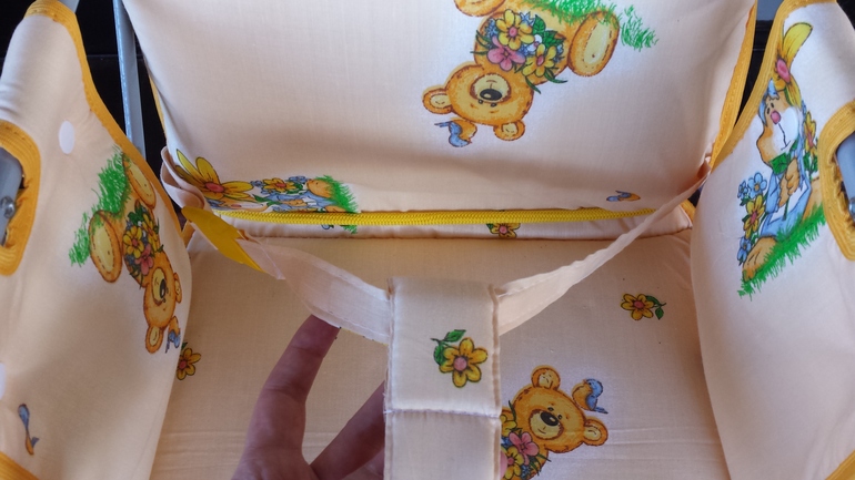 Сидение фиксируется на металлическом каркасе за счет боковинок на кнопках и при помощи тканевых "карманов" сверху и снизу.